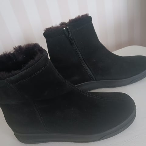 Mustat fleecevuorilliset nilkkurit kaksilla vetoketjuilla. Pohjassa liukuesteet. Olen säästänyt niitä liian kauan vaatehuoneessa, jalan malli muuttunut, niin eivät mahdu enää jalkaan.