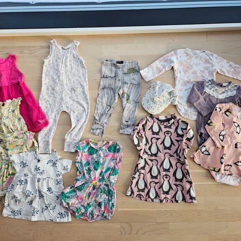 Kahdet samettihousut, yhdet college housut, yhdet röyhelöpyllyt, kaksi mekkoa, yksi paita, yksi neuletakki, kolmet sukkahousut, yksi collegehaalari. Osa vaatteista todella siistejä, osassa vähän kulumaa, osassa muutama pieni tahra. Kaikki ehjiä. Merkkeinä name it, Lindex, newbie, ym.