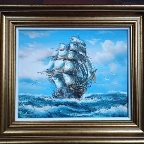 Kehystetty maalaus, jossa on useita purjelaivoja. Teos esittää purjeveneitä vesistöllä, värit ovat pehmeitä ja lämpimiä. Kehyksen materiaali on puu. Koko 70x90cm. Takaosan maalarinteipillä pitää vaihtaa. Taiteilijalta ei tule enää uusia teoksia. Myydään tarjousten perusteella.