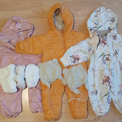 Toppahaalari, jonka saa jaloista myös yhtenäiseksi pussiksi. Vanuhaalari, merinovillahaalari, toppatumput ja -töppöset, sekä pipo. Haalarit kaikki kokoa 68-74.