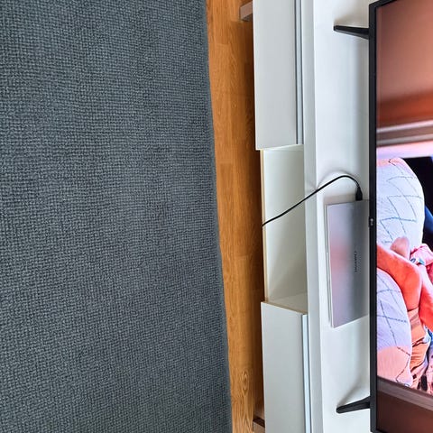 Ikean tv-taso, itse lisätyillä pinnijaloilla. laatikko ponnahdusmekanismilla ja reunoilla kaapit, joissa hylly.