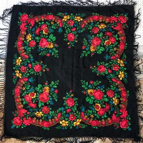 vintage maatuskahuivi kukkakuosi kukka villaa kukkakuviot kukkahuivi hapsuhuivi retro mustalaishuivi ruusuhuivi retrohuivi talvihuivi jättihuivi USSR Neuvostoliitto Neukku venäläinen uusuhuivi maatuska musta huivi hienokuntoinen ruusukuvioinen ohut villahuivi