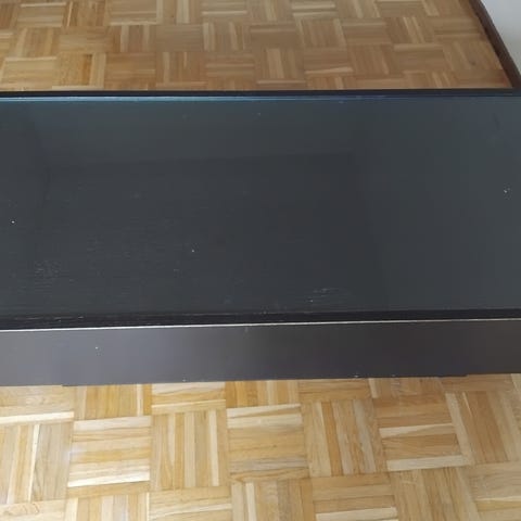 Musta teräksinen sohvapöytä / sivupöytä lasikannella. Lasikannessa on useampi pieni naarmu, jotka näkyvät läheltä. Ollut meillä käytössä sivupöytänä. Vain nouto Nurmijärven Lepsämästä.