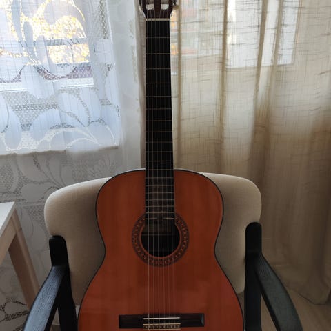 A beautiful vintage Spanish guitar from 1979, big sound. Solid deck, laminated sides, one size under normal size. Some writing on the deck, see pictures:) No cracks or damages.