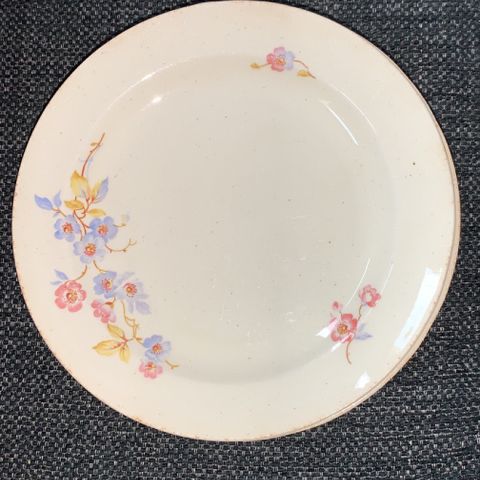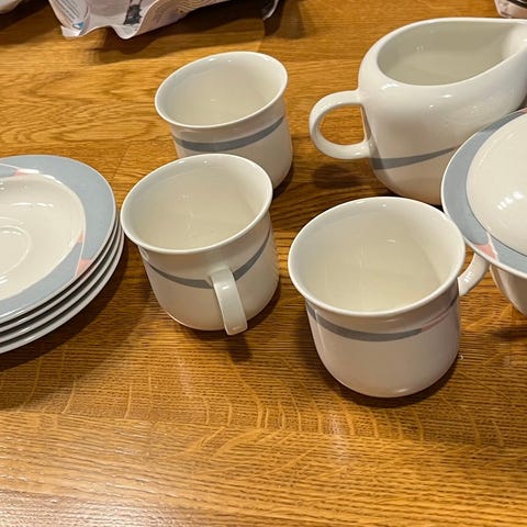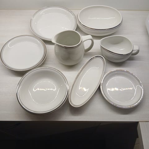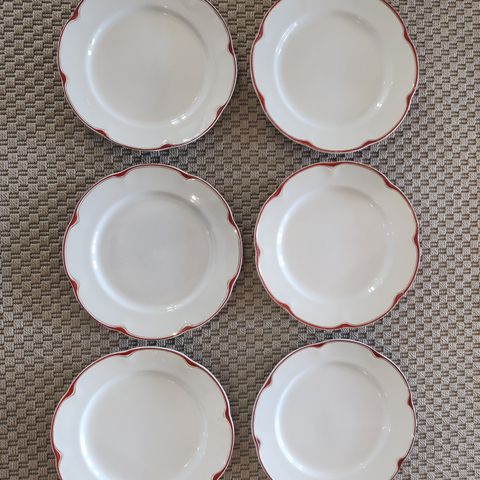 Arabia astiat Arki sarjaa. 6 lautasta halk. 23 cm, 6 syvää lautasta halk. 19,5 cm ja 6 pientä lautasta halk. 16,5 cm. Hyväkuntoiset, kultauksissa pientä kulumaa mutta kirkkaat. Yksi iso lautanen pohjassa hiushalkeama, joka menee läpi alaosaan (näkyy pinon päällimmäisessä lautasessa). 4 pieni lautasessa hieman pintä kolhua taustapuolella, mitkä näkyy kuvissa - yhdessä etu ja taustapuolella krakkeroitumaa. Hinta yht.
