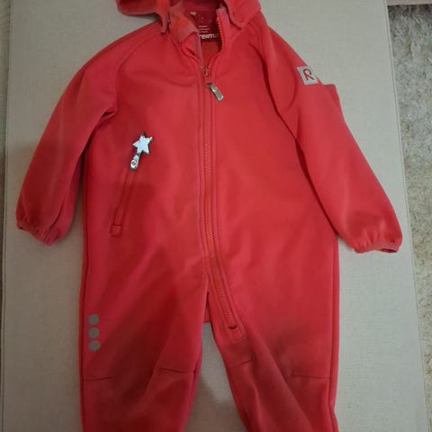 Lämmin välikausihaalari koossa 80 cm. Ehjä kangas, vetoketju toimii hyvin ja jalkalenkitkin kunnossa. Oranssi kangas on ottanut vähän tummaa väriä ulkoleikeissä hihoihin, vetoketjun reunoihin ja joihinkin muihin saumoihin. Värjäymät ei lähteneet tavallisessa konepesussa, mutta en ole yrittänyt pestä hankaamalla, ettei vedenpitävyys kärsi.