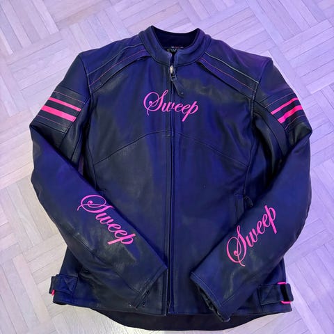 Sweep Mamba naisten nahkatakki musta, koko 42. Takissa on vetoketjulliset taskut ja CE-merkintä, joka viittaa suojaominaisuuksiin. Materiaali on nahkaa, ja takki on suunniteltu naisille.
