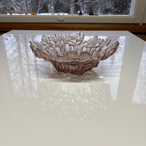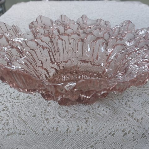 Riihimäen lasin kulho. Halkaisija 28cm, korkeus n.8 cm. Väri roosa.