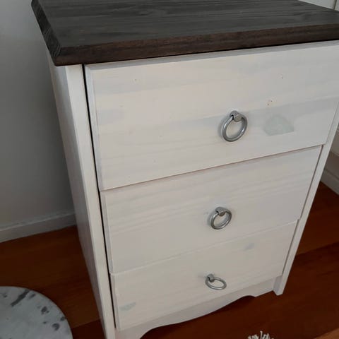 IKEA yöpöytä valkoisella pinnalla ja yhdellä laatikolla. Yöpöydässä on myös avoin hyllytila. Sopii makuuhuoneen tai muun tilan säilytykseen.