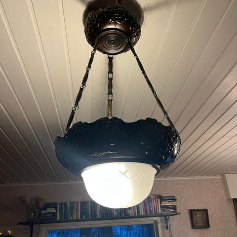 Vintage kattovalaisin, jossa on oranssi lasimaalaus ja metallinen varjostin. Sopii kahdelle lampulle. Metallin reunassa on pieni lommo, muuten hyvässä kunnossa.