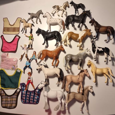 Maasturi, kuski, hevoskuljetustraileri, kaksi hevosta ja koira.