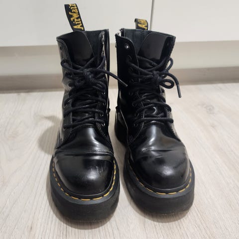 Myydään ihanat mustat Dr. Martens Jadon platform-kengät koossa 39. Nahkaiset saappaat, joissa on paksu pohja ja nyöritys edessä. Saappaissa vetoketjut sivuilla helpottamassa pukemista. Ainoana moitteena pieni naarmu vasemman kengän kärjessä.