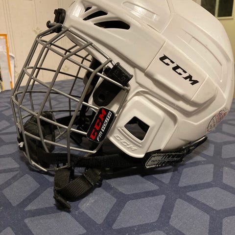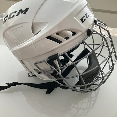CCM:n pienikokoinen jääkiekkokypärä alkuperäisellä ristikolla, saa toki irroitettua halutessaan. Oikein mainiossa kunnossa.