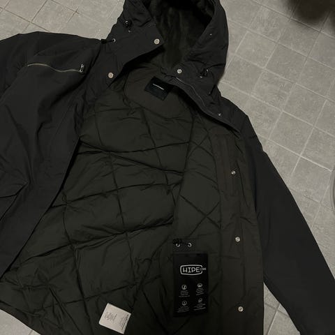 Vyötärökiristys mahdollisuus, etulista neppareilla kiinnitettävä, kaksisuuntainen edessä oleva vetoketju, hihoissa ranneresorit, konepesu 40 astetta, vähän käytetty.