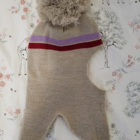 Suloinen ja lämmin Mainion myssy. 2 pientä reikää, toinen ulkopinnassa ja toinen suun kohdalla jossa myös tummentumaa. Pesty juuri villaohjelmalla, hajusteettomasti. Yleisilme ja vuori muuten siistit.