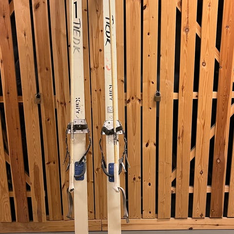 Sukset 130cm. Kuvasta näkyy pohjan vika. Siteiden hinnalla, side säädettävä. 10€
