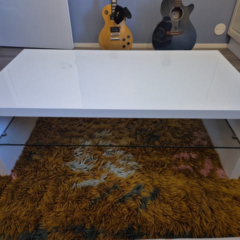 Siistissä kunnossa oleva sohvapöytä. Tason alla erillinen pienempi taso, jossa pinta hieman repsottaa kahdesta kohtaa (näkyy kuvassa)