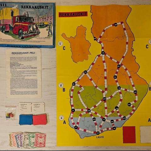 Harvinainen rekkapeli, kaikki osat tallella. Korteissa ja pelilaudassa taitoksia, setelit aivan sileitä.
