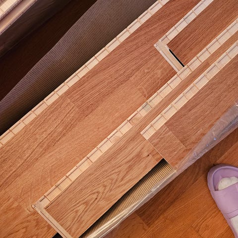 Uutta vaaleaa parkettia 14 levyä ja mitat 220cm x 16cm eli vähän vajaa 5 neliötä laskujeni mukaan. Mukaan saa rullan parketin alle tulevaa materiaalia.