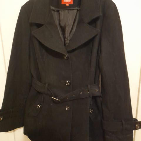 Naisten harmaa villakangastakki, koko 40. Ostettu Sokokselta.