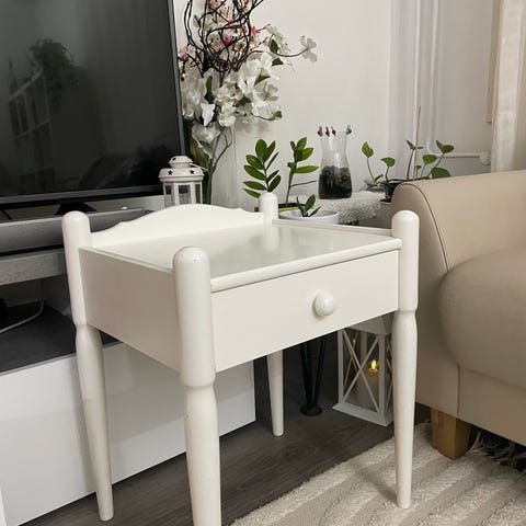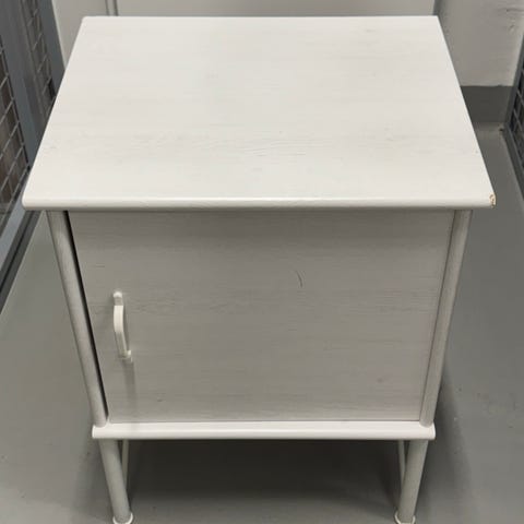 Hyväkuntoinen Ikean valkoinen metallinen yöpöytä jossa laatikko,pientä käytön jälkeä joka ei haittaa,haku sovitusti Helsinginkadulta.