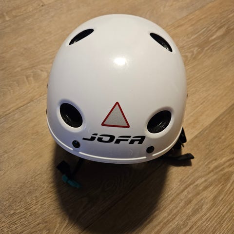 Jofa HT 415. Kypärä on ostettu luistelukäyttöön ja tarjoaa suojaa pään alueelle. Sopii myös muihin ulko-aktiviteetteihin. Varustettu säädettävällä leukahihnalla ja ilmanvaihtoaukkoilla. Sisävuori pehmeää materiaalia mukavuutta varten. Säädettävä koko 51,5-55,5cm.