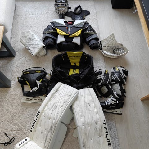 Siitä hyvät maalivahdin varusteet ulkojäille tai höntsäilyyn. Taisteluissa hyväksi todetut kamat ISOLLE miehelle. Itse olen pelannut näillä noin kolme kautta höntsää. Olen 182cm ja yli 110kg. Kamat keräilin reilu neljä vuotta sitten, osan ostin uutena, osa oli käytettyjä. Näillä ei kovempikaan lämäri satu. Käytönjälkeä löytyy, mutta ei mitään joka varusteiden pelattavuuten vaikuttaisi. Myyn mieluummin vain koko settinä, hinnat yksittäin hiukan korkeammat.