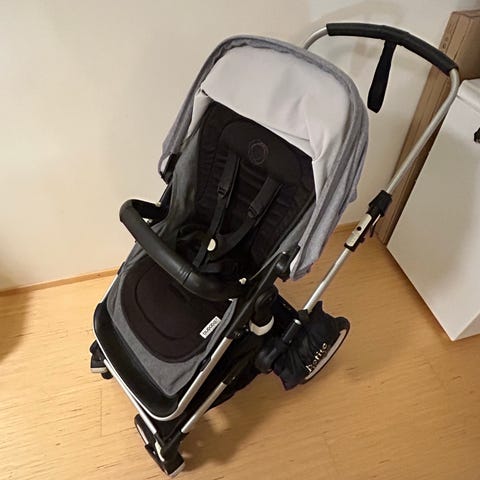 Farkkusinisen väriset Bugaboo Fox -yhdistelmävaunut. Patjat ovat puhtaat (kuvassa).