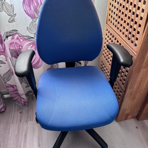 Annetaan pieni, ehkä jopa lastenkokoinen työtuoli. Säädöt ja rullat toimii, mutta yksi sivu hieman revennyt (kuva) ja muutenkin ulkonäöltään parhaat päivänsä nähnyt.
