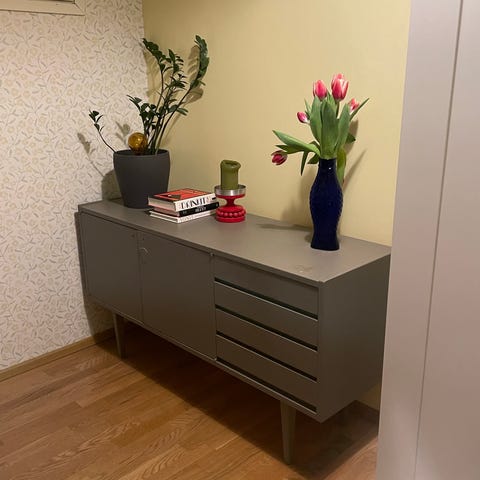 Mid-century-tyylinen senkki. Käytön jälkiä on runsaasti, mutta yleiskunto silti hyvä. Etenkin tasossa jälkiä, jotka varmaan saisi senkin huoltamalla huomaamattomammiksi. Takalevyyn tehty muutama aukko johtoja varten. Nouto Mäntymäestä (asap).
