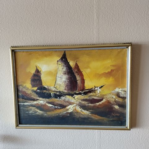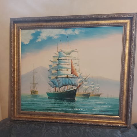 Öljyvärimaalaus, jossa on kuvattuna purjelaiva merellä. Kehyksissä on koristeellinen kultainen reunus. Maalaus on signeerattu nimellä Ambrose.