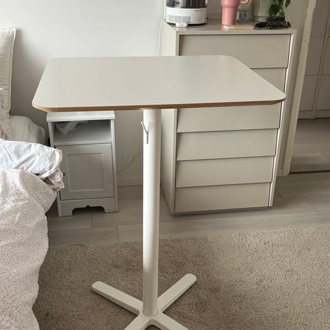 Neliönmuotoinen musta laminaattipintainen pöytä, jossa on pyöreä metallinen jalka. Pöydän kulmassa on pieni vaurio.