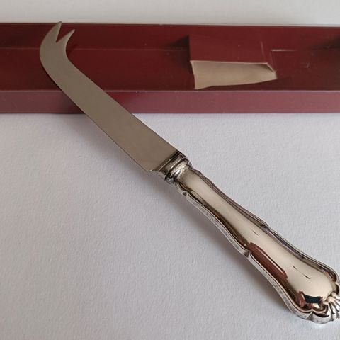 Myydään hopeavartinen juustoveitsi, klassista Chippendale-mallia.