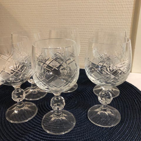 Kuusi kirkasta kristallista viinilasia, joissa on koristeellinen kaiverrus. Lasit ovat jalallisia ja niissä on geometrinen kuviointi.
