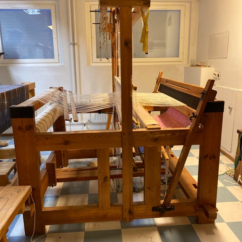 Vanhat mutta todella hyvät kangaspuut. Varsia ja polkusia hyvä pino ja kasa joten halutessaan saa polkea vaikka mitä väkkärää.