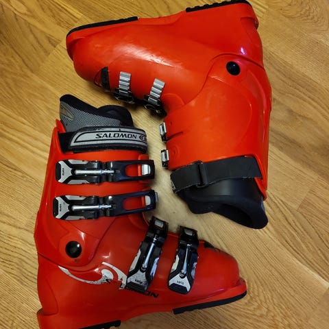 Salomon TF 4 laskettelumonot mustassa ja harmaassa värissä, koko 28 eli n. 43. Monot ovat varustettu säädettävillä soljilla ja muovipohjilla, jotka tarjoavat vakautta ja tukea lasketteluun.