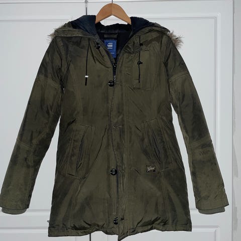 Ruskea lämmin talvitakki, koko M. Kaksipuolinen takki, jonka toinen puoli on tikattua toppatakkia ja toinen sellaista pörrömäistä turkkia.