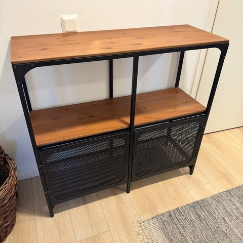 Myydään hyväkuntoinen Ikean Fjällkinge avohylly vetolaatikoilla. Korit saa kaupan päälle halutessaan.