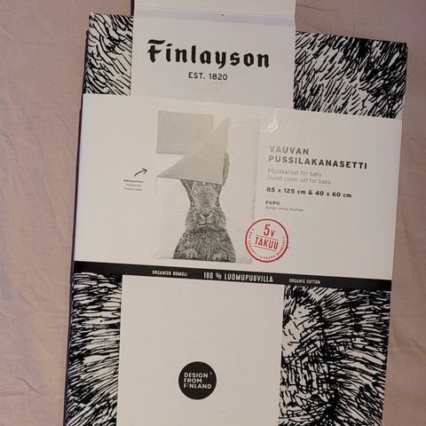 Finlayson pupu Pussilakana ja tyynyliina vauvalle. Toinen puoli ja tyynyliina harmaat. Vähän pidetty, ei siis uusi. Koko valmistajan sivujen mukaan 135x85cm.