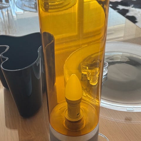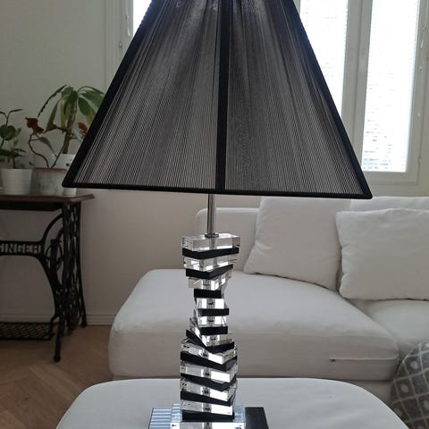 Näyttävä ja kaunis valaisin. Vuosia ollut käytössä mutta kunnossa ei moitteita. Korkeus n. 50cm. Polttimo (pieni kanta) ei sisälly hintaan.