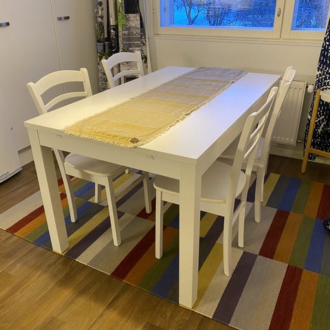 Pöydän pinnassa muutama kupru ja jälki (näkyy kuvissa). Tuolit tukevat ja hyvässä kunnossa.