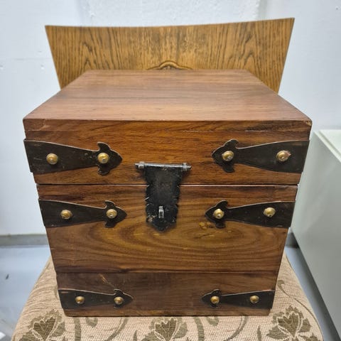 Acaziapuinen arkku, jossa on metalliset takorauta yksityiskohdat ja sisäpuolella viinipullojen säilytyslokerot