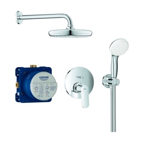Ylimääräiseksi kaappiin jäänyt uusi Grohe sadesuihku. Setti sisältää suihkusekoittajan.