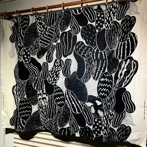 Kaunis retrokangas. Värit säilyneet hyvänä ja kirkkaana, kangas paksua. Muutamia huomautettavia löytyi, niistä kuvat.