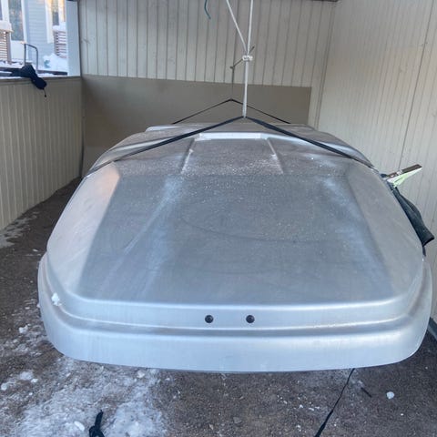 Hyväkuntoinen leveä suksiboksi näppärällä kiinnityksellä.