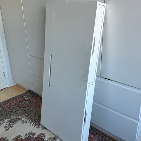 Annetaan pois Ikea Bekant kulmapöydän levy. Ollut käytössä kauan, mutta vaihdettu uuteen neliskanttiseen pöytälevyyn. Käytön jälkiä on paljon ja maalikin naarmuntunut.