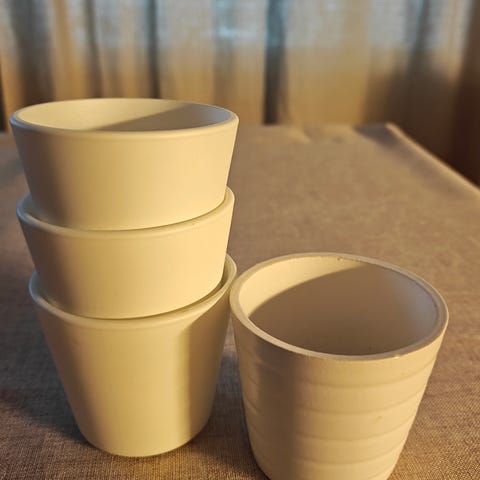 IKEA kukkaruukut, joissa sinivalkoinen kukkakuvio. Materiaalina keramiikka.