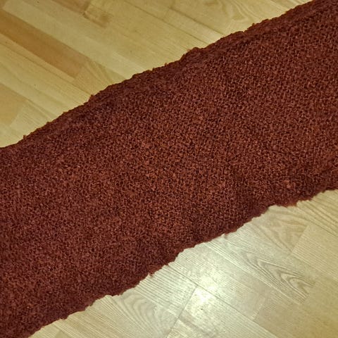 HM tuubihuivi, ympärysmitta n. 160cm, leveys n. 60cm, ulkopuolella ja sisäpuolella langannousut. Väri vaikea kuvata, viimeisessä kuvassa vasten valkoista ja vaaleanpunaista.