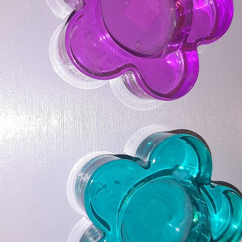Partyliten tuikkukipot huurrettua lasia, reunassa metallinen kukkakoriste, missä vaaleanpunaisia ja -sinisiä kiviä. Muuten lähes moitteettomassa kunnossa, mutta kaikissa on yhdessä kohdassa pientä naarmua, ovat ehkä hankautuneet toisiaan vasten.