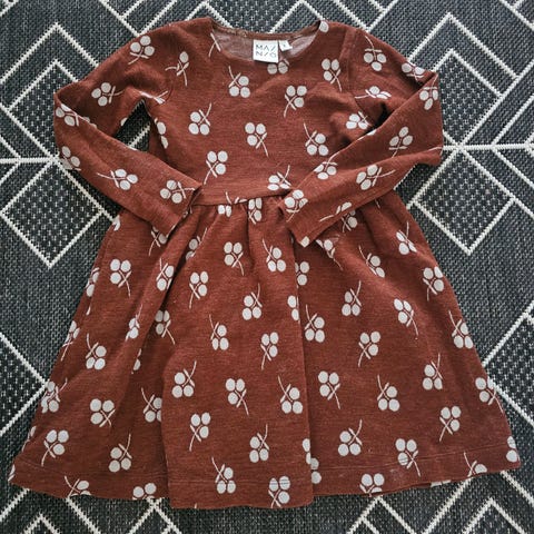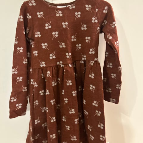 Mainion merinovillainen frillamekko, koko 110-116 cm. Pieniä lankalenkkejä esim. hihassa. Ei reikiä eikä huopumaa.